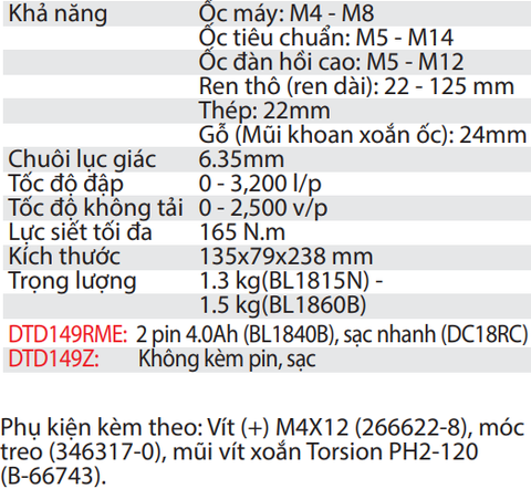Máy Bắt Vít Dùng Pin DTD149 ( Z, RME ) 18V với tốc độ không tải lên đến 2.500 vòng/phút và tốc độ đập lên đến 3.200 vòng/phút, sản phẩm này có thể thực hiện việc siết ốc máy, tiêu chuẩn, đàn hồi cao và ren thô với kích thước từ 22-125mm và ở độ lực siết tối đa lên đến 165 N·m. Với kích thước chỉ 135x79x238mm và trọng lượng 1.3 kg, Makita DTD149Z cực kỳ gọn nhẹ và dễ dàng mang theo bất cứ nơi nào mà bạn muốn