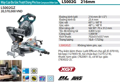 Máy cưa đa góc trượt dùng pin Makita LS002GZ (40Vmax) là sản phẩm mang đến cho bạn khả năng cưa đa góc tuyệt vời từ thẳng 0 độ đến nghiêng 45 độ.Ngoài ra, máy còn có nhiều tính năng tiên tiến như công tắc với nhiều lựa chọn, có thể thay đổi tốc độ cắt phù hợp với nhiều mục đích sử dụng khác nhau. Sản phẩm có xuất xứ từ thương hiệu nổi tiếng Makita, đảm bảo chất lượng và độ tin cậy cao.
