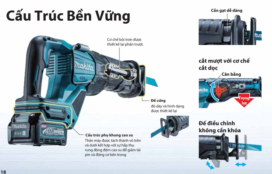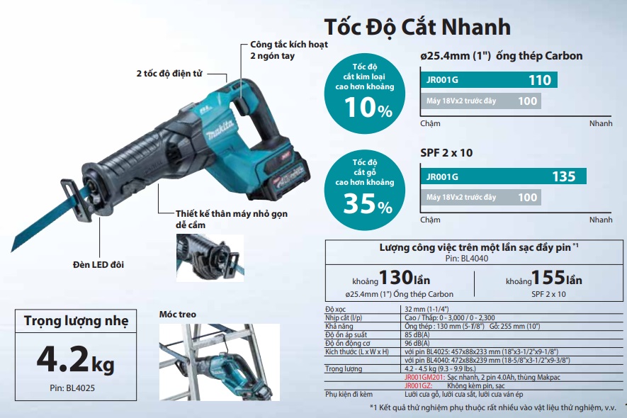 Máy kèm lưỡi cưa gỗ, lưỡi cưa sắt, lưỡi cưa ván ép. JR001GM201: Sạc nhanh, 2 pin 4.0Ah, thùng Makpac. JR001GZ: Không kèm pin, sạc Bảo hành: 6 tháng chính hãng |