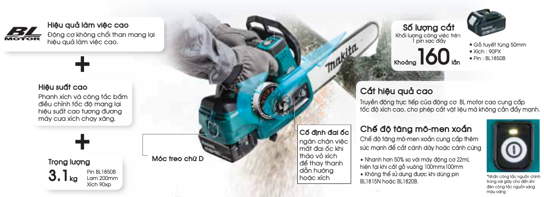 Máy được thiết kế với công tắc mở/tắt ngay tay cầm, giúp bạn mở và tắt máy chỉ bằng một thao tác đơn giản, tiện lợi khi sử dụng. Máy Cưa Xích Dùng Pin DUC254Z/DUC254Z002 18V 250mm là công cụ hỗ trợ đắc lực dành cho bạn, sử dụng chuyên dụng để cưa, cắt các thanh gỗ, thân cây lớn... giúp tiết kiệm thời gian và sức lao động. Sản phẩm có tính ứng dụng cao trong các ngành công nghiệp, khai thác, xây dựng…