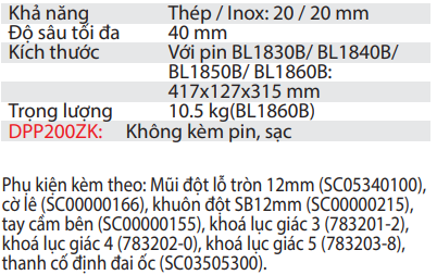 Máy Đột Lỗ Thủy Lực Dùng Pin DPP200ZK 18V ( Không bao gồm pin, sạc ) là máy đột dùng pin 18V LXT Li-Ion và có khả năng đục lỗ có đường kính lên tới 20mm thông qua một tấm thép dày tới 8mm .