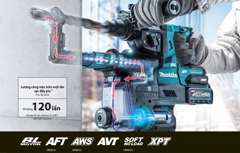 Máy khoan đa năng dùng pin Makita HR003GD201/ HR003GM201 / HR003GZ có thể tích hợp thêm hệ thống hút và loc bụi HEPA Filter DX12 chuẩn mang lại hiệu quả cao cho công việc, an toàn sử dụng và tiết kiệm chi phí dọn dẹp vệ sinh công trình sau khi khoan đục.