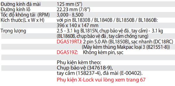 Máy Mài Góc Dùng Pin DGA519RTJ/DGA519Z 18V sử dụng pin Li-ion 18V LXT , và được trang bị với cơ chế X-LOCK