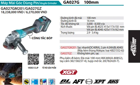 Bạn đang tìm kiếm một máy mài góc cầm tay tiện lợi và mạnh mẽ thì máy mài góc dùng pin Makita GA027GZ/ GA027GM201 (Vmax) sẽ là một sự lựa chọn tuyệt vời cho bạn. Với công suất mạnh mẽ, thiết kế nhỏ gọn và tiện dụng,đặc biệt máy được trang bị pin sạc đi kèm thì chiếc máy này có thể giúp bạn hoàn thành các tác vụ mài, cắt và bóc tách một cách dễ dàng.