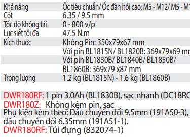 Máy Siết Bu Lông Xuyên Tâm Dùng Pin DWR180 ( Z / RF ) 6.35/9.5mm (1/4'' / 3/8'') 18V là máy siết bu lông xuyên tâm chạy bằng pin Li-Ion 18V LXT và được phát triển dựa trên kiểu WR100D được cung cấp bởi pin Li-Ion 12Vmax CXT.