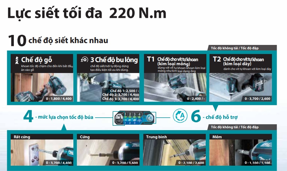 4 mức lựa chọn tốc độ búa & 6 chế độ hỗ trợ |