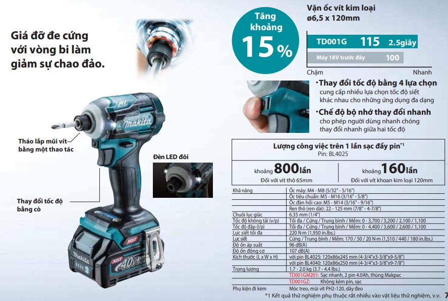 Máy Vặn Vít Dùng Pin TD001GM201 có giá đỡ đe cứng với vòng bi làm giảm sự chao đảo và đèn LED đôi phù hợp cho cả những góc làm việc thiếu sáng nhất. Máy Makita TD001GM201 có thể tháo lắp mũi vít bằng một thao tác, thay đổi tốc độ bằng 4 lựa chọn và có chế độ bộ nhớ thay đổi nhanh.